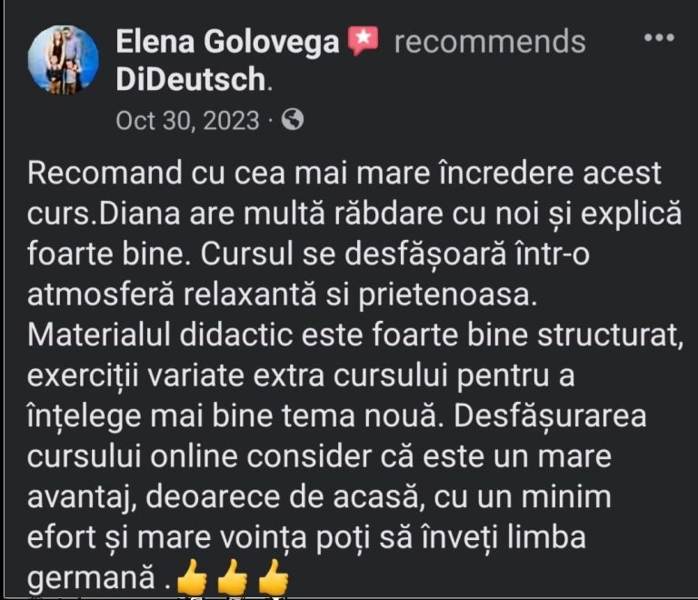 În continuarea cursurilor de nivel A1, în care am învățat cuvinte și expresii de bază, abordăm subiecte mai complexe legate de viață de zi cu zi și de mediul de lucru. Învățați cum să participați la discuții și dezbateri, cum să prezentați și să argumentați puncte de vedere, cum să rezolvați probleme sau cum să gestionați conflictele la locul de muncă.
